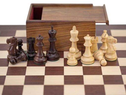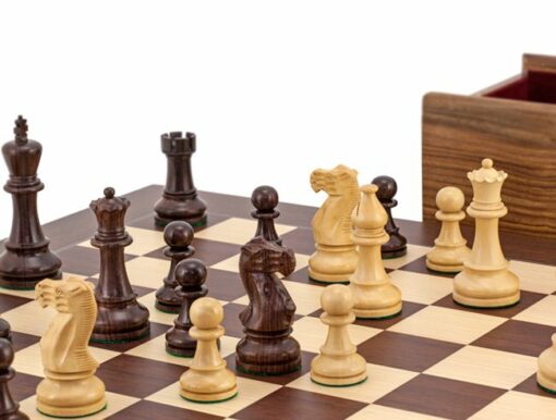 Enfin, l’ensemble comprend un coffret de rangement pour les pièces d’échecs en palissandre doré et est doté d’un couvercle coulissant traditionnel. A l’intérieur de l’étui, il y a un grand compartiment doublé de tissu doux pour les pièces d’échecs, parfait pour ranger les pièces lorsqu’elles ne sont pas utilisées.