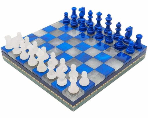 Jeu d’Echecs et Echiquier en Marbre Bleu et Blanc